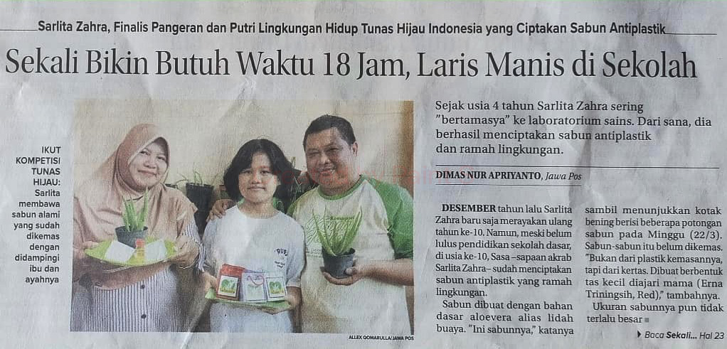 Selain sabun, Sarlita juga membuat pembersih tangan, sirup, stik, puding, dan pestisida. “Dan yang terbaru, saya memproduksi permen aloevera,” kata siswi SDN Pakis III yang tinggal di Jalan Pakis Sidorejo I Surabaya ini.